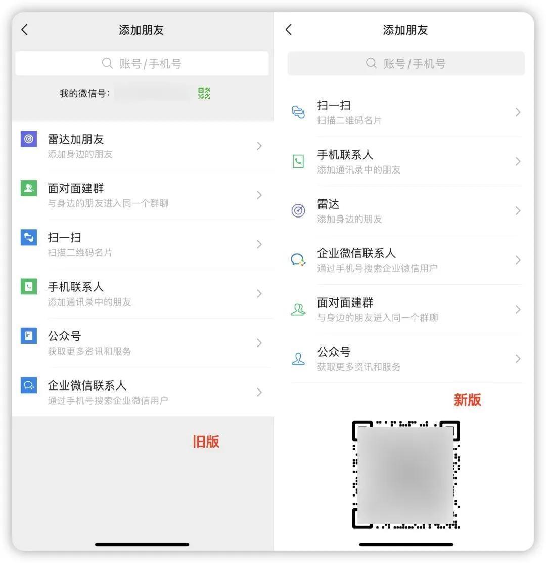 新版本中,添加好友的界面得到了显著改进。当你点击右上角的“+”后选择“添加朋友”,你会发现原本位于搜索框底部的微信号和二维码被移动到了最下方,并且放大了显示区域。这一设计使得用户在添加好友时更加直观方便,尤其是当使用二维码添加时,自己的二维码直接显示在界面下方,更加便于其他人扫码添加。